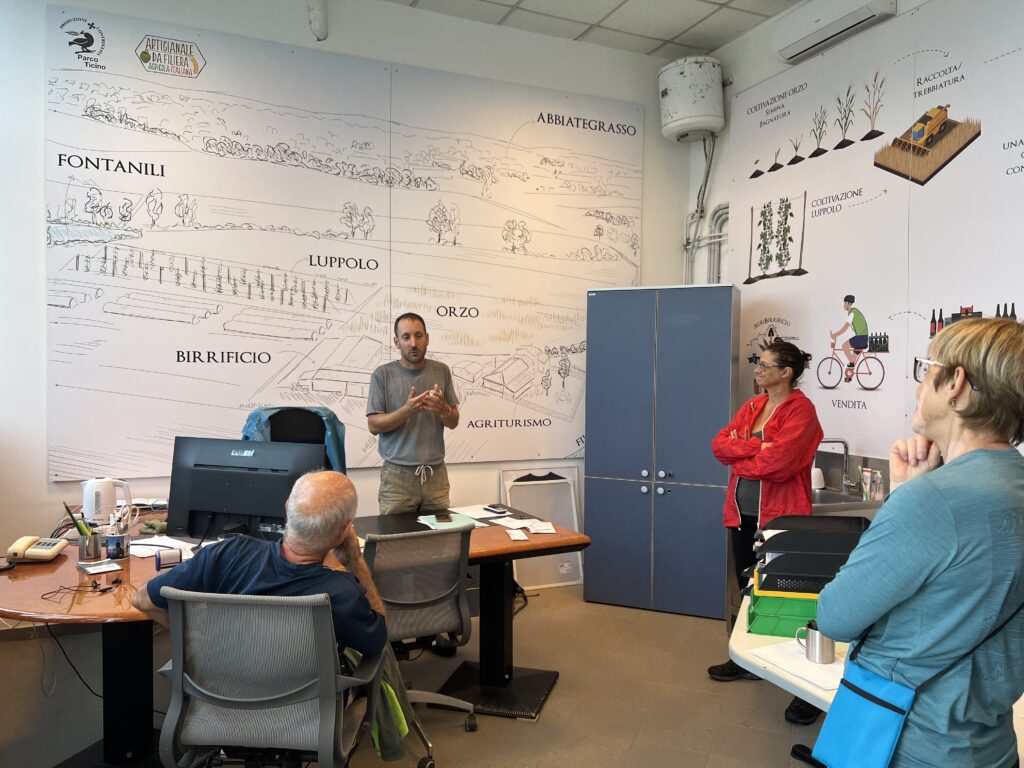 Il cammino è partito dal punto vendita della Coop di Vigevano. Dopo circa dieci chilometri, la prima tappa è stata l’Agribirrificio Morosini, ospitato nella storica Cascina Morosina. Fondata nel Seicento, la cascina è uno dei primi insediamenti agricoli sorti nella pianura alluvionale del fiume Ticino. La sua lunga storia è profondamente intrecciata al lavoro della terra, all’allevamento e alla produzione cerealicola. Oggi, grazie a un progetto innovativo e sostenibile, la cascina ospita un birrificio agricolo che utilizza esclusivamente orzo e materie prime coltivate in loco, a chilometro zero. Una bella sosta allietata dai prodotti dell’agriturismo e poi da una visita guidata di Filippo, della terza generazione di agricoltori. “Quando è arrivato il momento di iniziare a lavorare ho chiesto di poter riprendere la tradizione di famiglia e occuparmi delle nostre terre. Da lì poi è nata la scelta di realizzare un birrificio”.