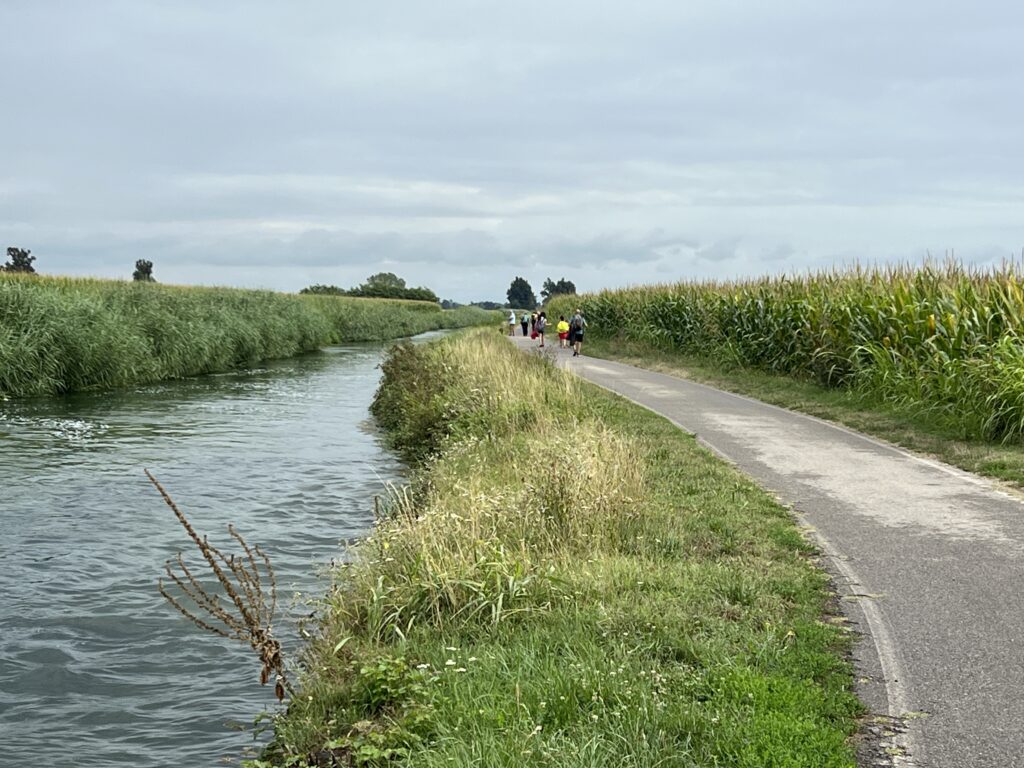 Il cielo poi ha iniziato ad aprirsi e il sole ha fatto capolino dando un segnale chiaro ai camminatori. Si può riprendere la strada perché siamo solo a metà dell’itinerario. Un passaggio dal centro di Abbiategrasso per vedere il castello e poi da lì gli ultimi sei chilometri lungo il naviglio di Bereguardo per arrivare a Morimondo. I navigli lombardi sono tra le più grandi opere idrauliche dell’Italia preindustriale, veri capolavori di ingegneria idraulica e simbolo dell’identità della Pianura Padana. Tra questi, il Naviglio di Bereguardo occupa un posto speciale, non solo per la sua funzione storica, ma anche per il suo legame profondo con la bonifica e la coltivazione del territorio.
